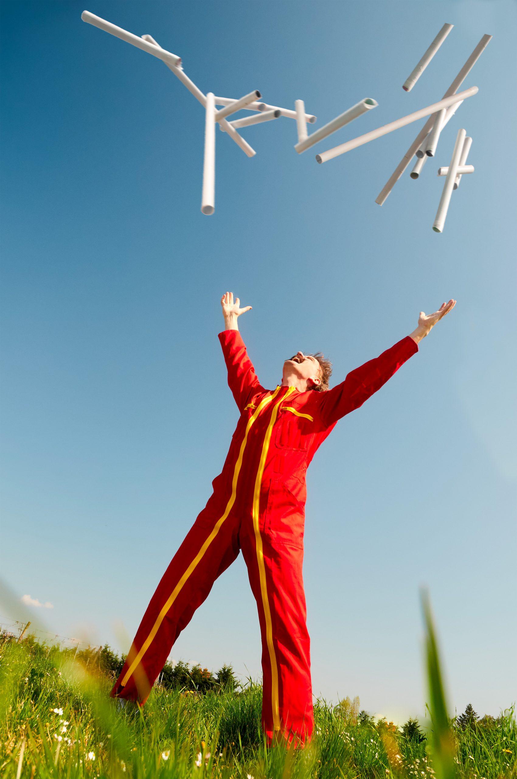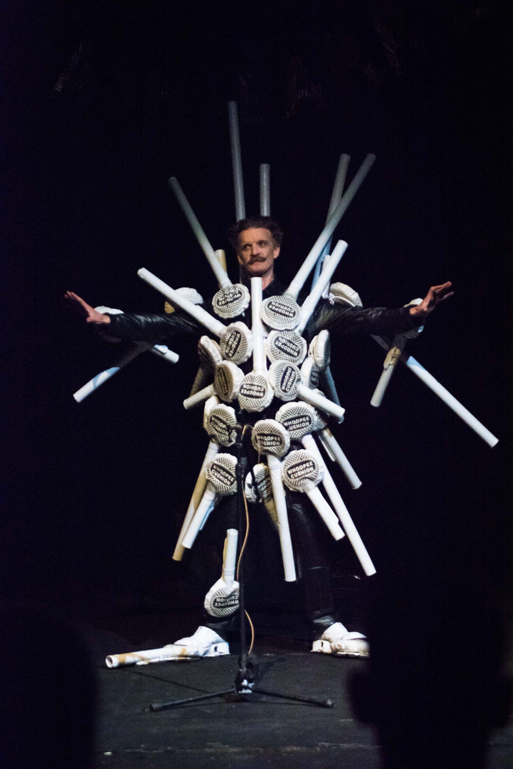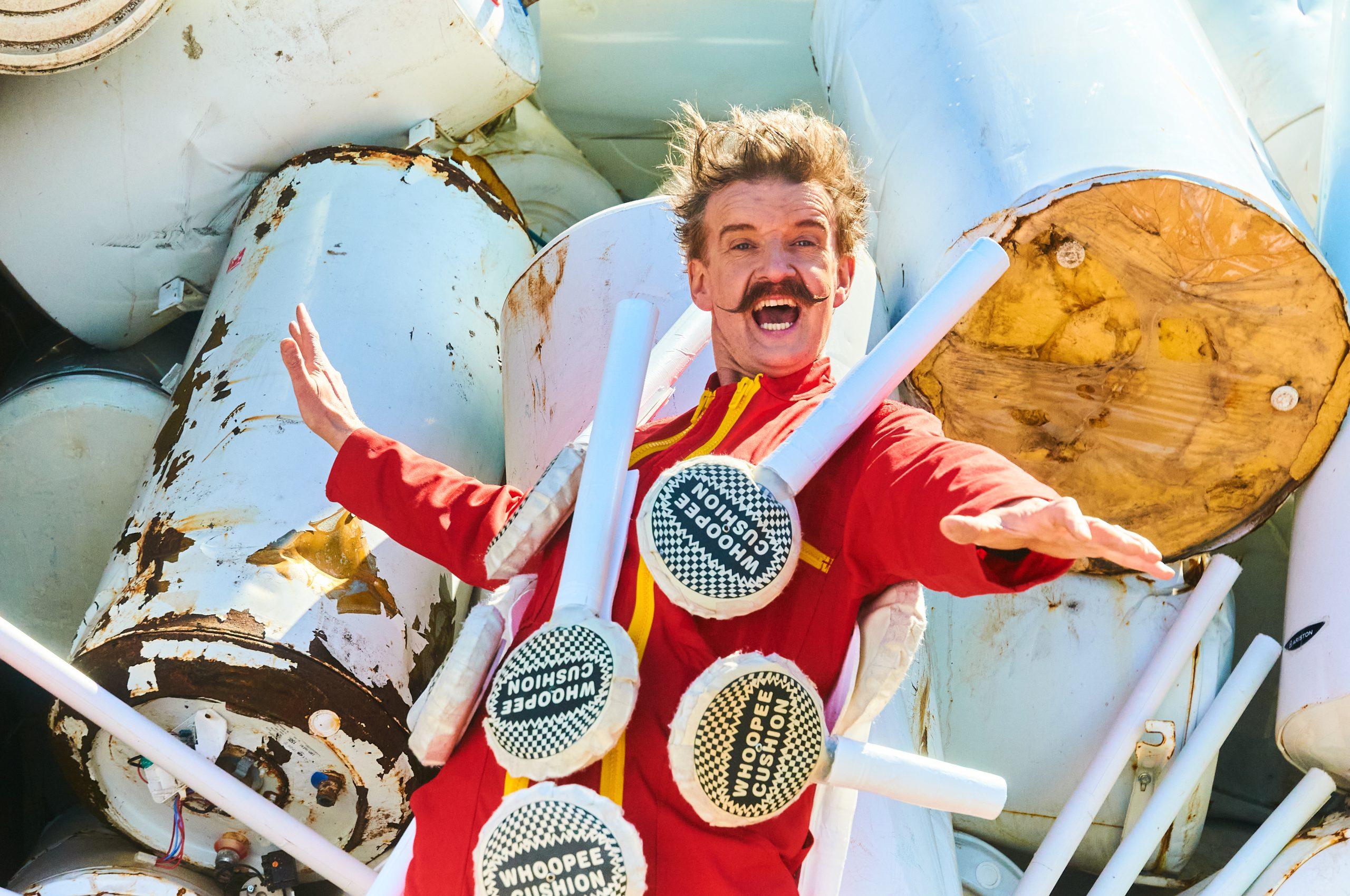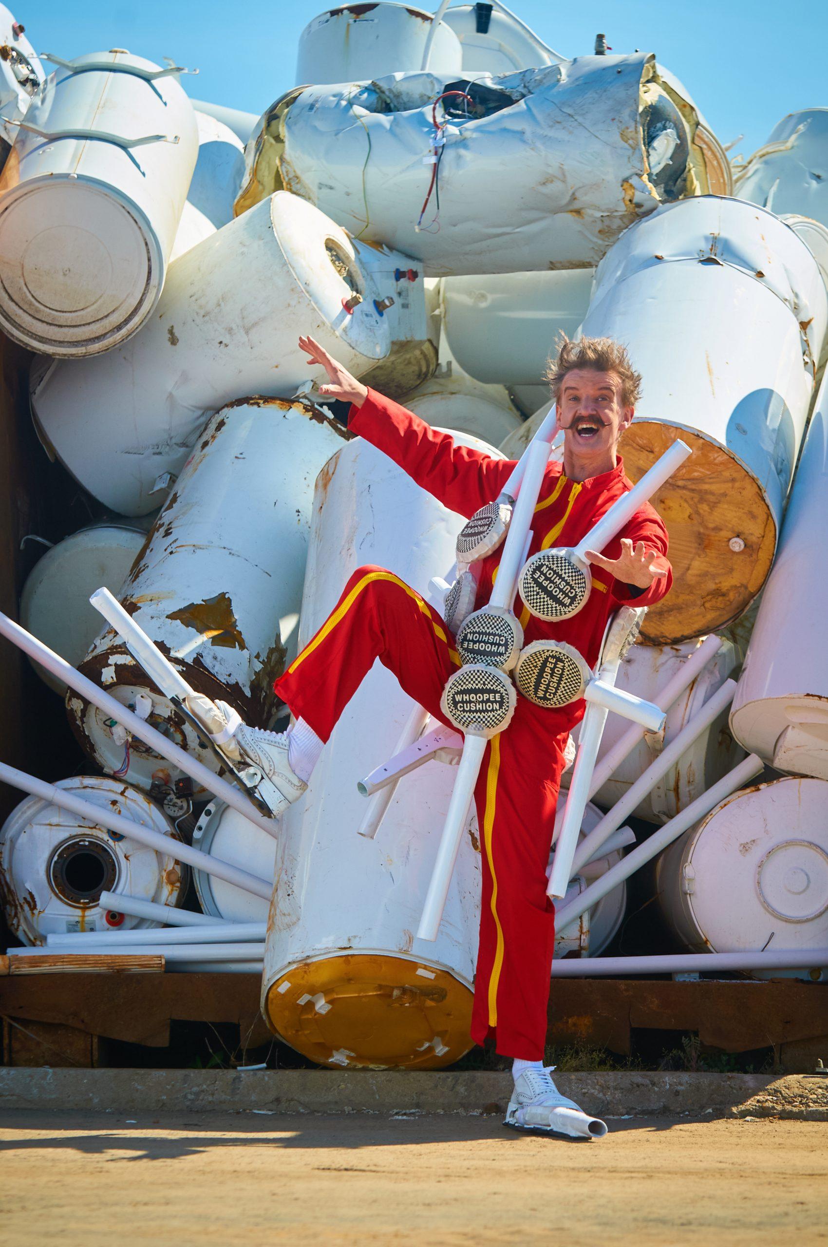 Physical theatre, object manipulation and a symphony of absurd live music all collide with contemporary clown, culminating in an unforgettable stunt of stupidity- A high dive onto a giant whoopee cushion which expands out from the drinking fountain.